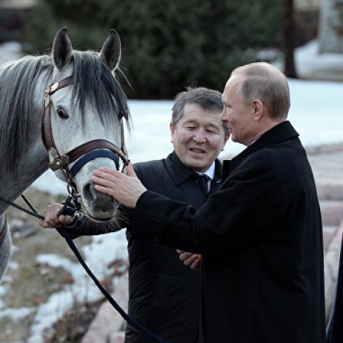 Утром 1 марта личный фотограф президента КР Султан Досалиев выставил в соцсетях несколько снимков Путина и Атамбаева с лошадью серой масти и подписал: "После переговоров… (Государственная резиденция "Ала-Арча", 28 февраля 2017 года)".
